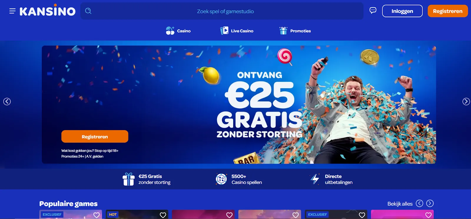 | Kansino bonus no deposit | €25 gratis bij registratie, 30x inzetvereiste |