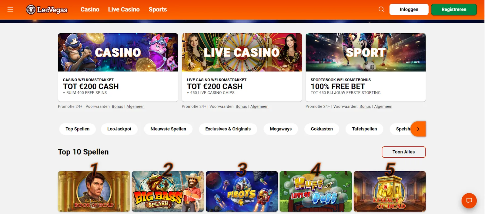 Dit zijn spellen die exclusief voor of door LeoVegas gaming zijn ontwikkeld. Voorbeelden zijn LeoVegas Megaways en LeoVegas 10000x Gold. Deze titels zijn nergens anders speelbaar. Het LeoJackpot-systeem koppelt een progressieve jackpot aan populaire bestaande slots zoals Book of Dead — een unieke toevoeging die je bij andere legale casino’s niet aantreft.
