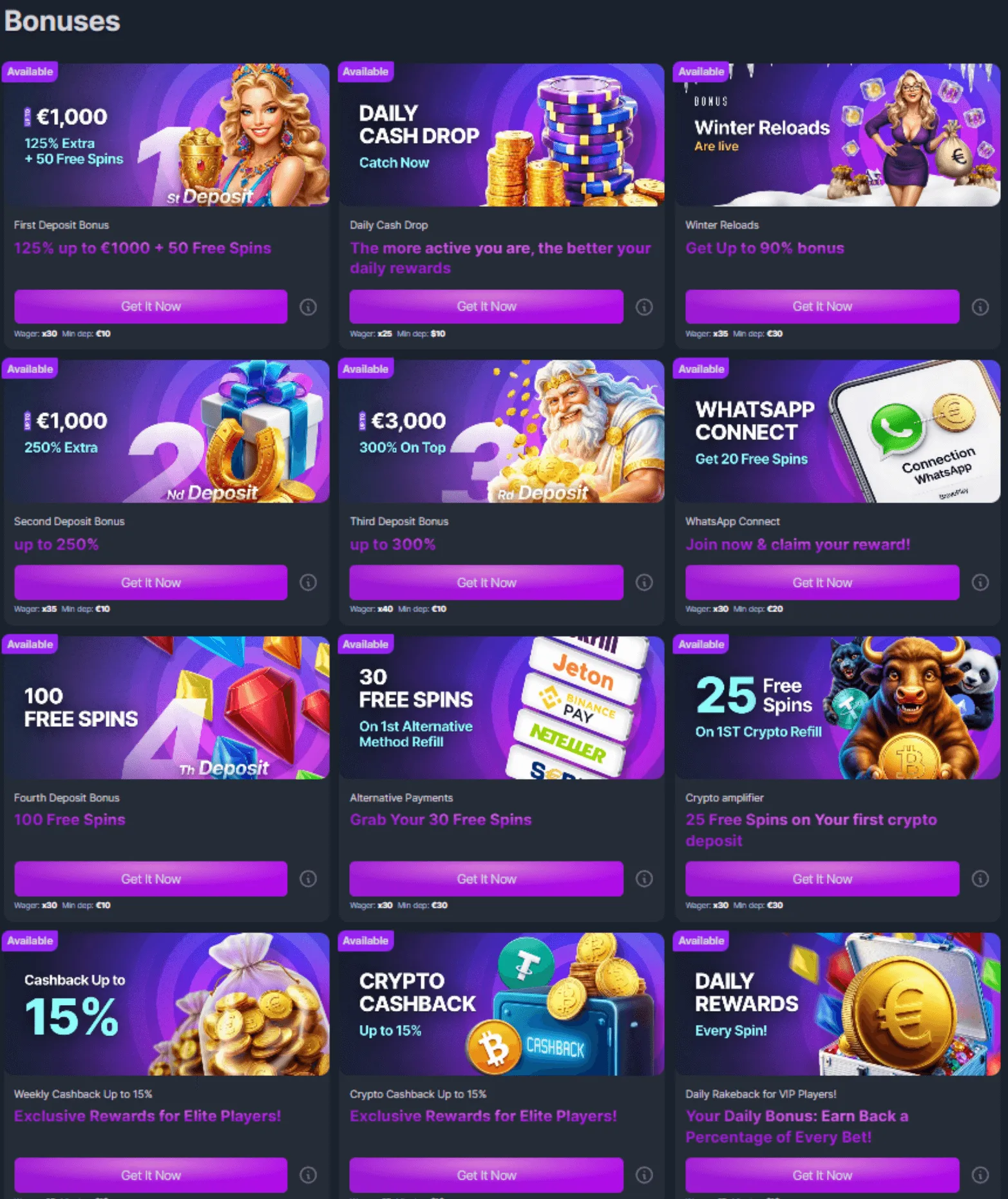 Bravoplay biedt een uitgebreid bonusprogramma voor nieuwe en bestaande spelers. Het programma bevat verschillende bonuscategorieën met welkomstbonussen en dagelijkse beloningen. Elke individuele bonus heeft unieke voorwaarden die spelers duidelijk moeten begrijpen.