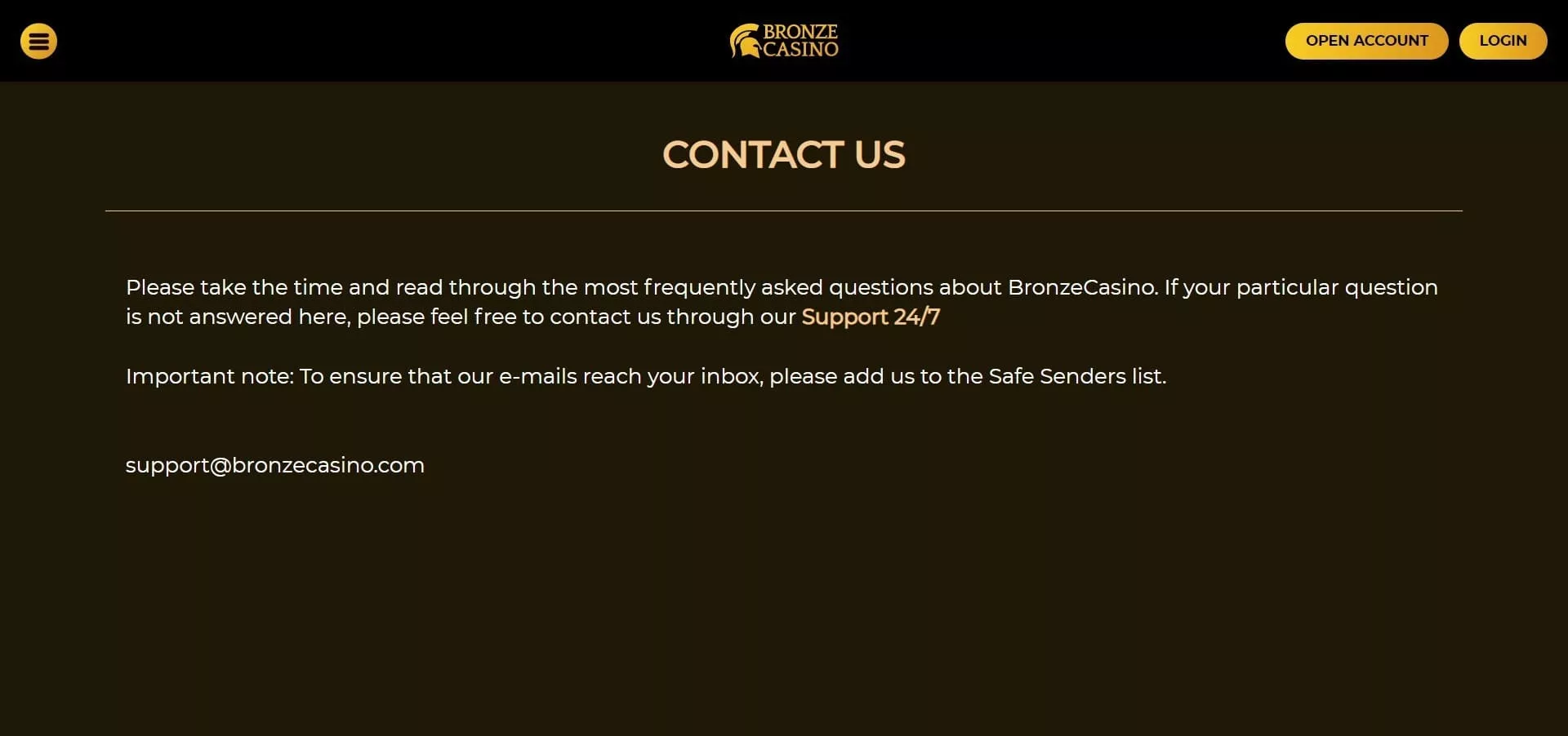 Als er zich problemen voordoen dan kun je contact opnemen met de klantenservice van het Bronze casino. Deze kan op verschillende manieren bereikt worden. Allereerst beschikt het Bronze casino over een live chat, die een groot aantal uren per dag beschikbaar is. Daarnaast heeft het casino een telefoonnummer dat 13 uur per dag bereikbaar is. Verder heeft het casino een postadres op Cyprus en kun je ook een e-mail sturen naar de supportafdeling. Verder is er een uitgebreide vraag- en aanbodafdeling op de website. Al met al voldoende mogelijkheden dus.