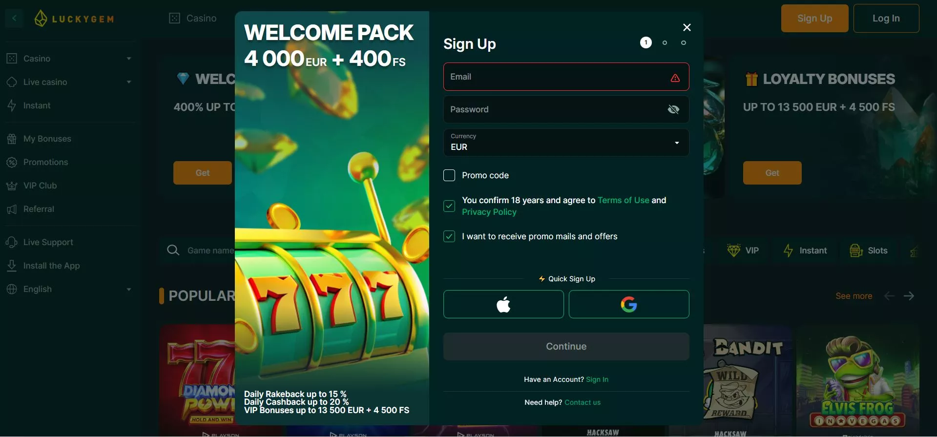 De registreer bij Luckygem casino online begint met een bezoek aan de officiële website en het klikken op de registratieknop in de rechterbovenhoek. Vul het formulier in met een geldig e-mailadres, maak een sterk wachtwoord aan en bevestig dat u meerderjarig bent.