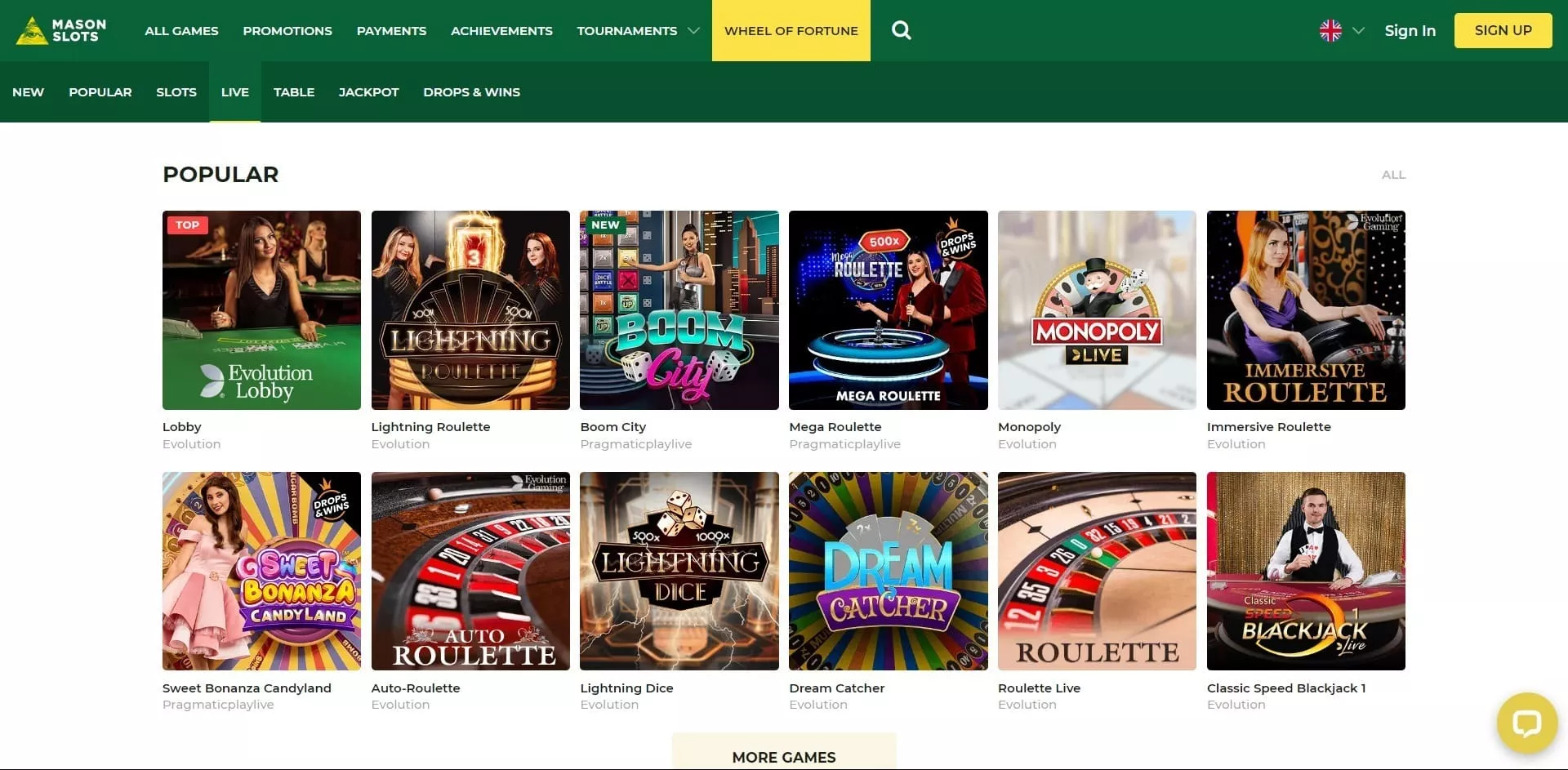 Binnen het Mason Slots live casino vind je spelvarianten van onder meer roulette en baccarat, maar er zijn ook spel shows. Die laatste categorie omvat bijvoorbeeld titels zoals Dream Catcher, Monopoly en Lightning Dice.