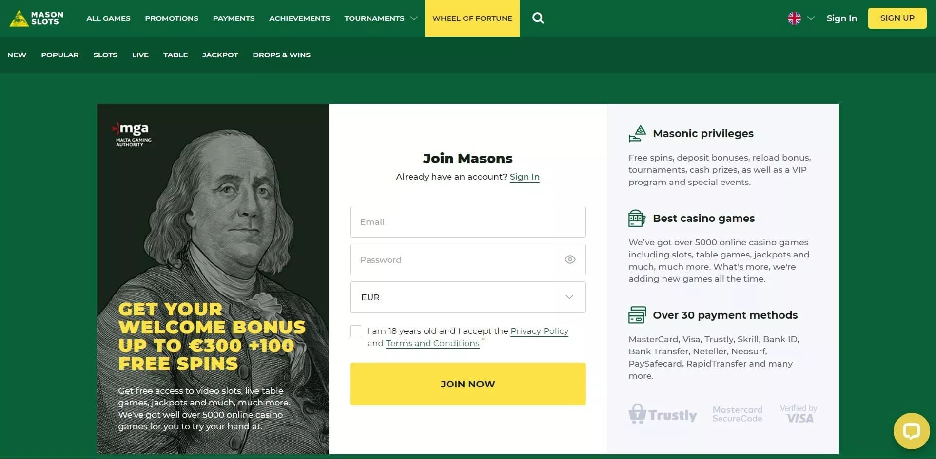 Je bij Mason Slots casino online aanmelden is eenvoudig. Klik op registreren, voer de gevraagde gegevens in en je kunt snel geld gaan storten. Lees alleen dus wel eerst deze recensie, zodat je zeker weet dat dit de moeite waard is.