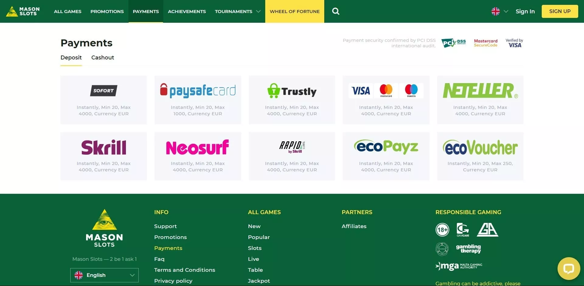 Je kunt bij Mason Slots onder meer gebruik maken van de volgende betaalmethodes: Neteller, Skrill, Trustly, MasterCard, EcoPayz en de EcoPayz voucher. Een groot deel hiervan is ook geschikt om de MasonSlots uitbetaling snel te laten verlopen.