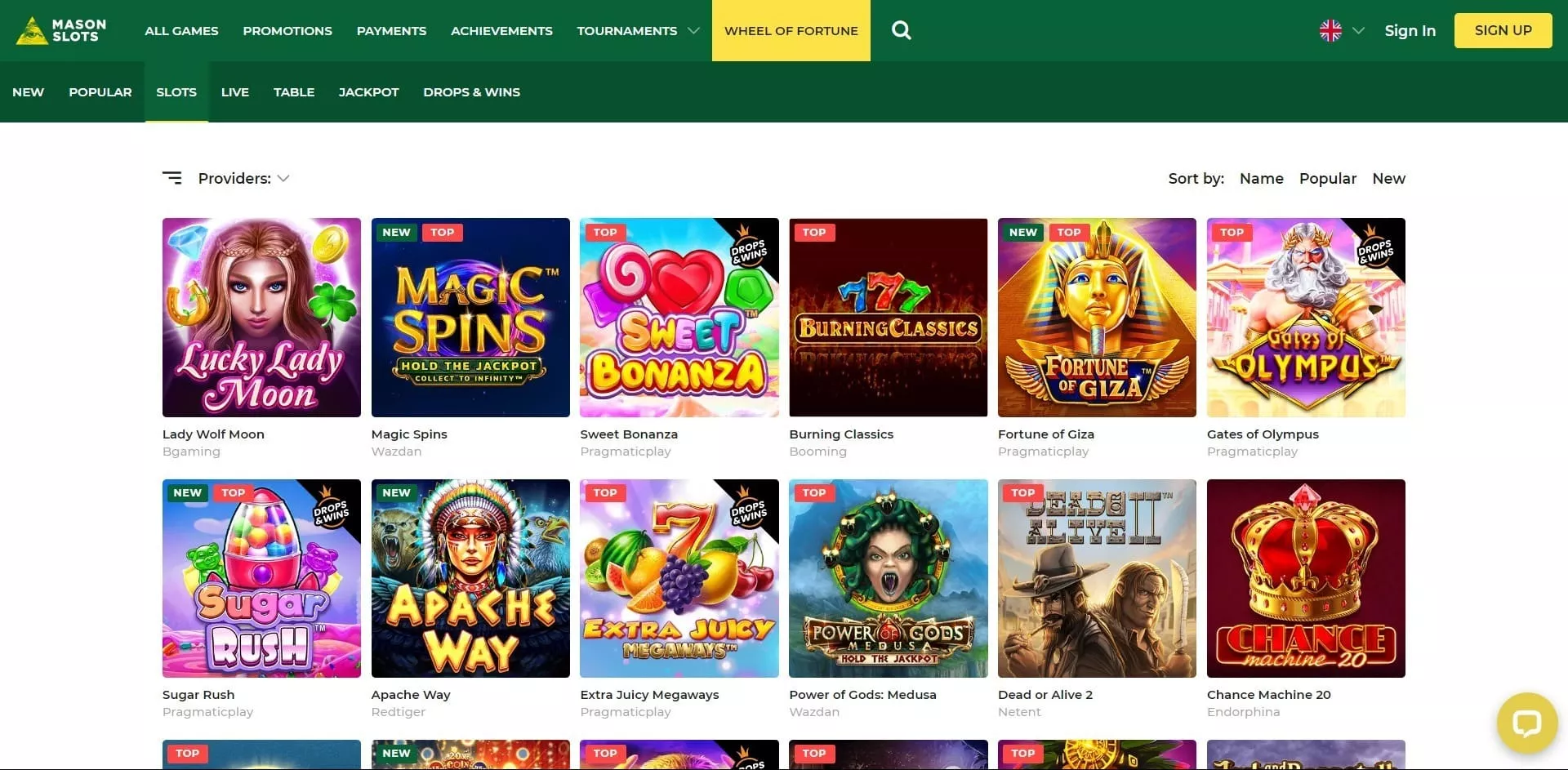 Bij Mason Slots vind je onder meer spellen van Pragmatic Play, Booming en Wazdan. Populaire spellen zijn dan ook Floating Dragon, Jelly Reels en The Dog House Megaways. Naast het complete overzicht aan slots vind je ook een aparte lijst met populaire spellen en een sectie met toptitels.