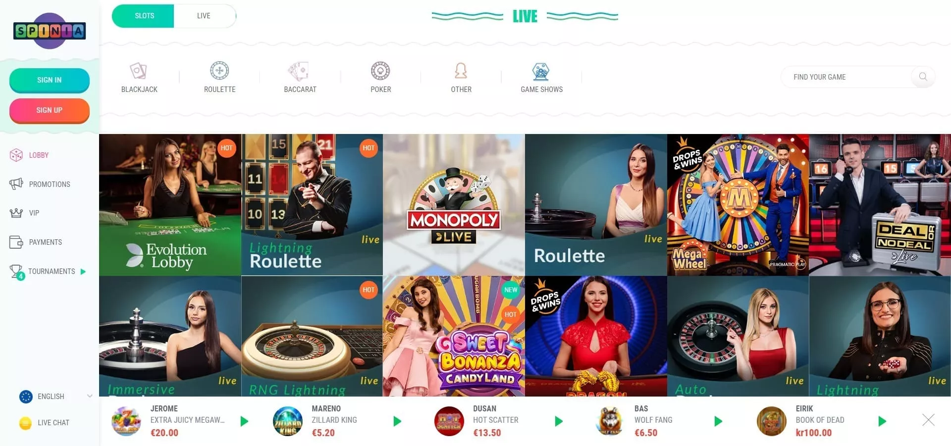 Het Spinia live casino staat garant voor een bijzondere spelervaring. Wanneer je graag bovenop de actie zit en niets wilt missen tijdens het spelen, is dit zeker iets voor jou. Je kunt in het live casino van Spinia roulette spelen, maar ook andere tafelspellen zoals blackjack, baccarat en craps. Deze zijn er bovendien in meerdere varianten. Ook zijn er een aantal spannende en meeslepende spelshows zoals Crazy Time, Monopoly Live, Deal Or No Deal en Mega Wheel.