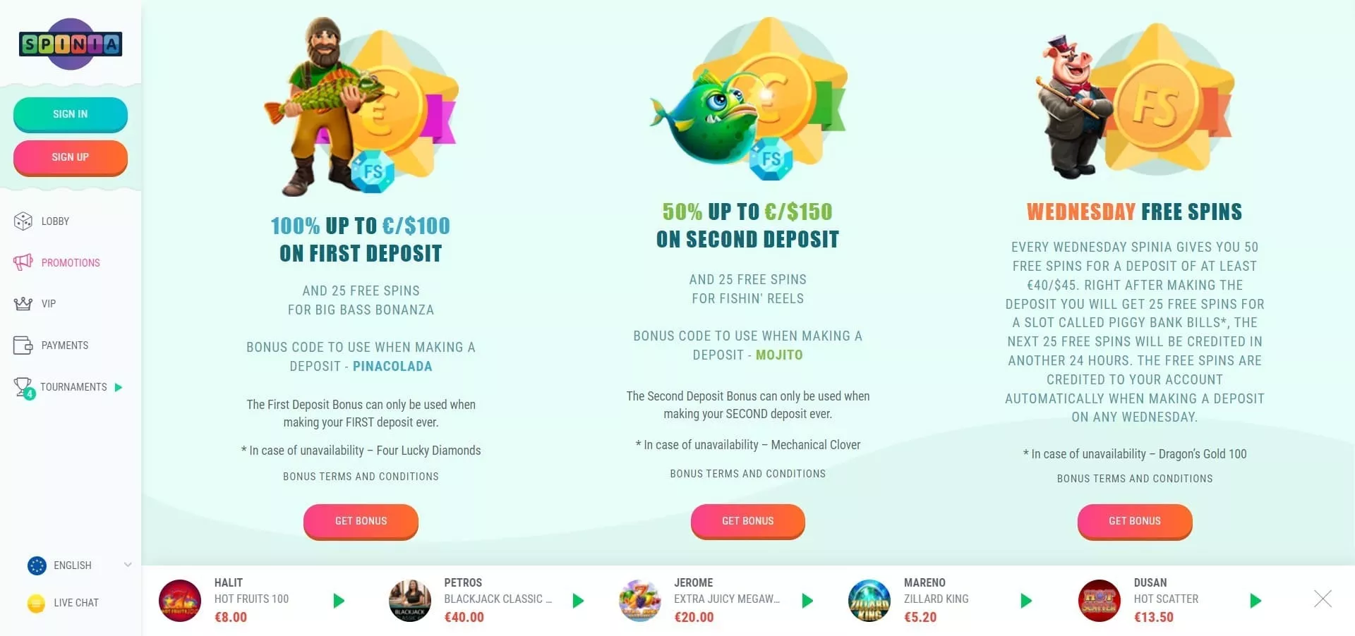 Jezelf voor de eerste keer bij Spinia casino online aanmelden en geld storten gaat gelijk samen met een lucratieve welkomstbonus. Sterker nog, je krijgt niet alleen een mooie stortingsbonus bij de eerste keer dat je geld overmaakt, maar ook bij de tweede keer. In eerste instantie gaat het om 100 procent tot aan maximaal 100 euro en 25 gratis spins voor de Big Bass Bonanza gokkast van Pragmatic Play. Bij de tweede storting zul je 50 procent extra ontvangen tot aan 150 euro en 25 gratis spins voor de gokkast Fishin’ Reels van dezelfde software leverancier.